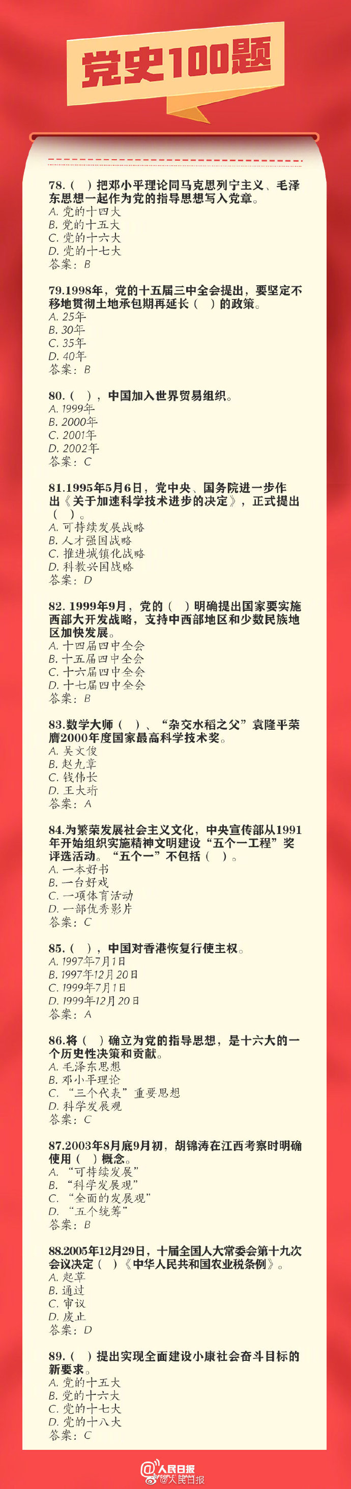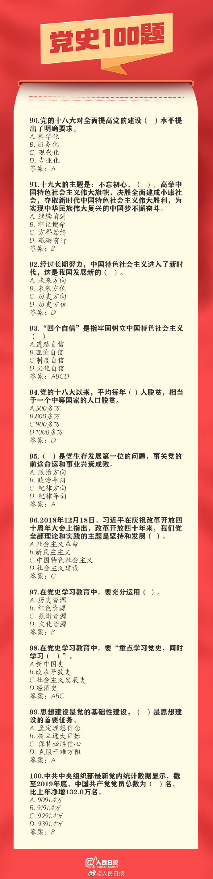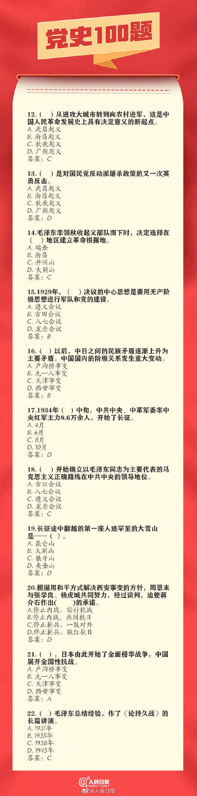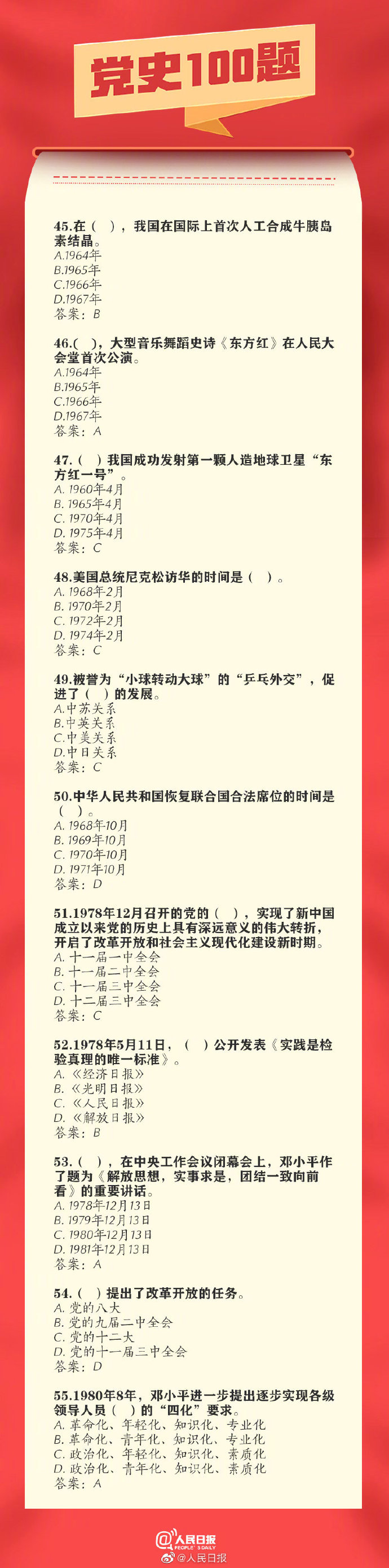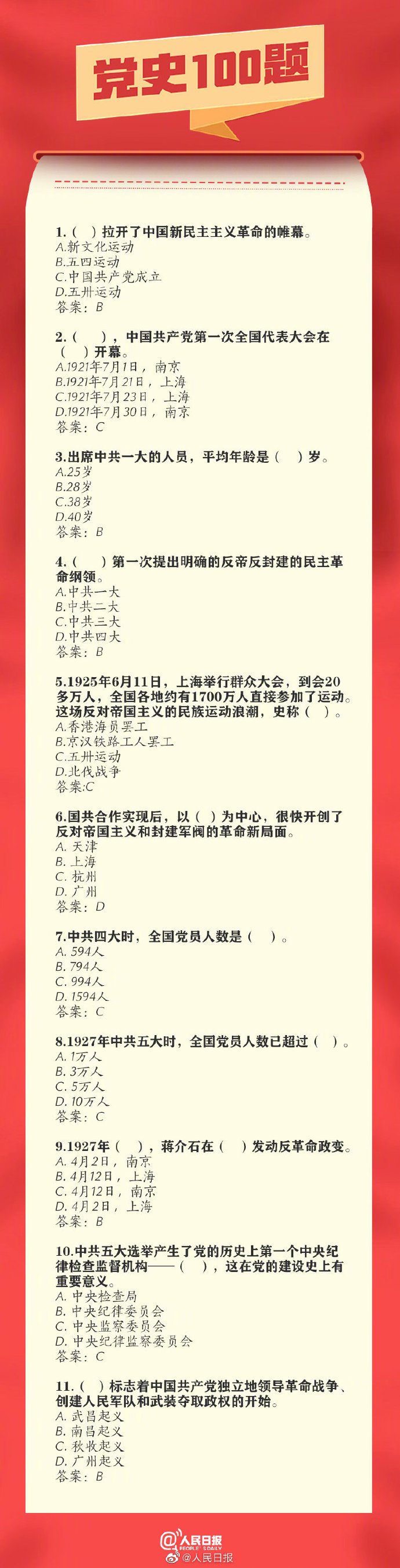 03-16 11:31:00閱讀()人民日?qǐng)?bào)【百年黨史100題,你會(huì)做幾道?】你知道出席中共一大的人員平均年齡是多少歲嗎?中共黨員是何時(shí)超過1000萬人的?我國的改革開放由哪次會(huì)議揭開序幕?……無論我們走得多遠(yuǎn),都不能忘記來時(shí)的路。100題重溫百年黨史,戳圖學(xué)習(xí)↓↓中國共產(chǎn)黨100周年,收藏!