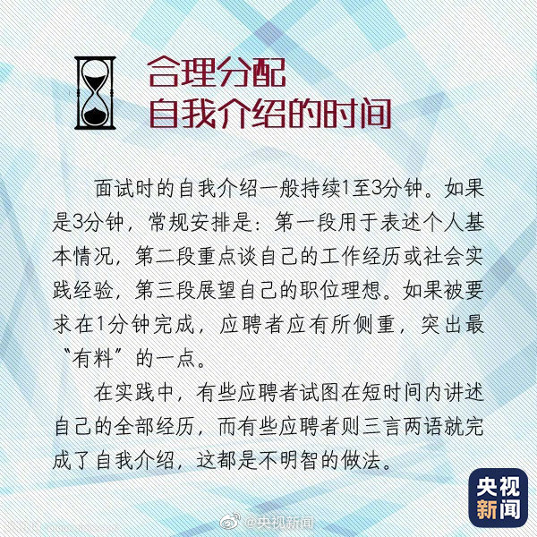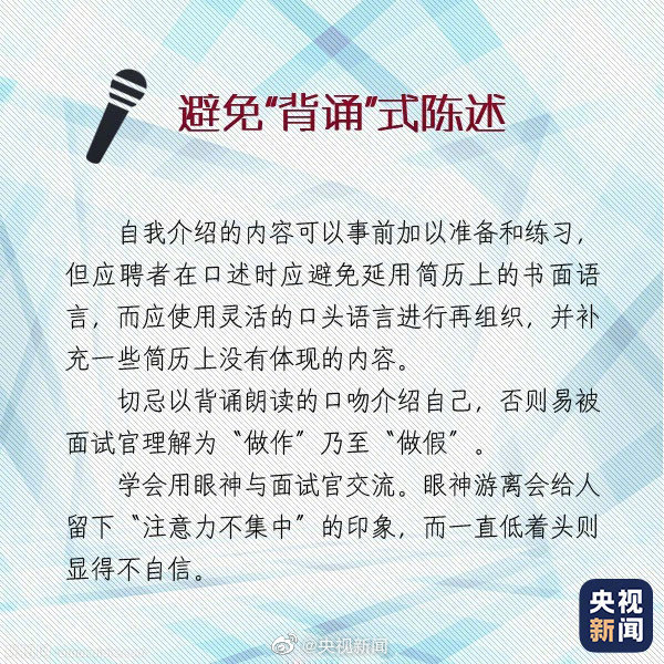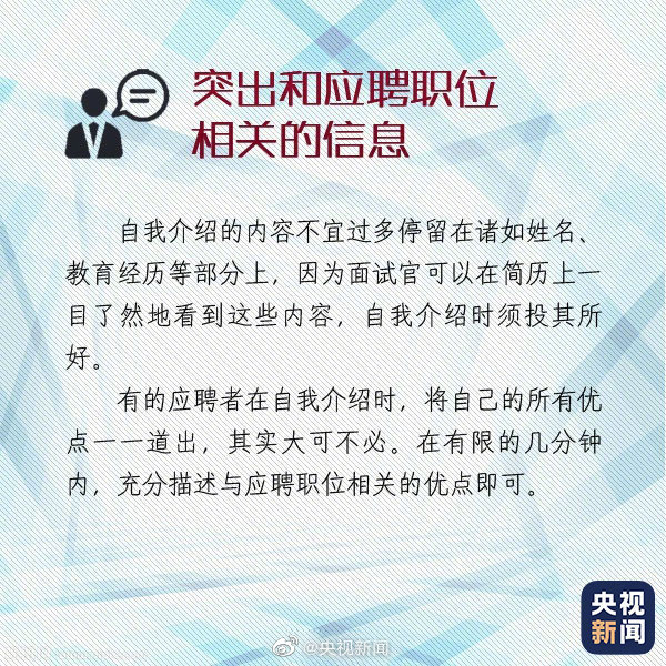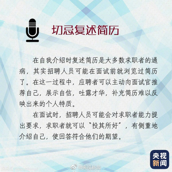 08-19 15:57:52閱讀()央視新聞求職面試時(shí)的自我介紹有“四大注意”: