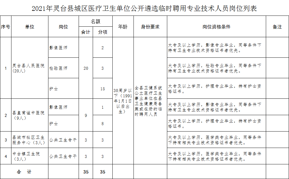 具體詳見《2021年靈臺縣城區(qū)醫(yī)療衛(wèi)生單位公開遴選臨時聘用專業(yè)技術人員崗位列表》。