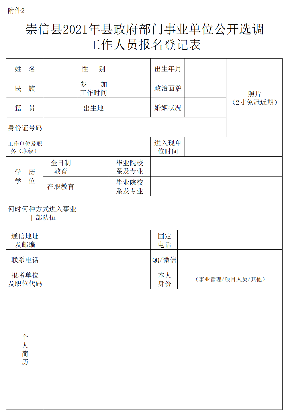 (2)填寫《崇信縣2021年縣政府部門事業(yè)單位公開選調(diào)工作人員報(bào)名登記表》(附件2)。