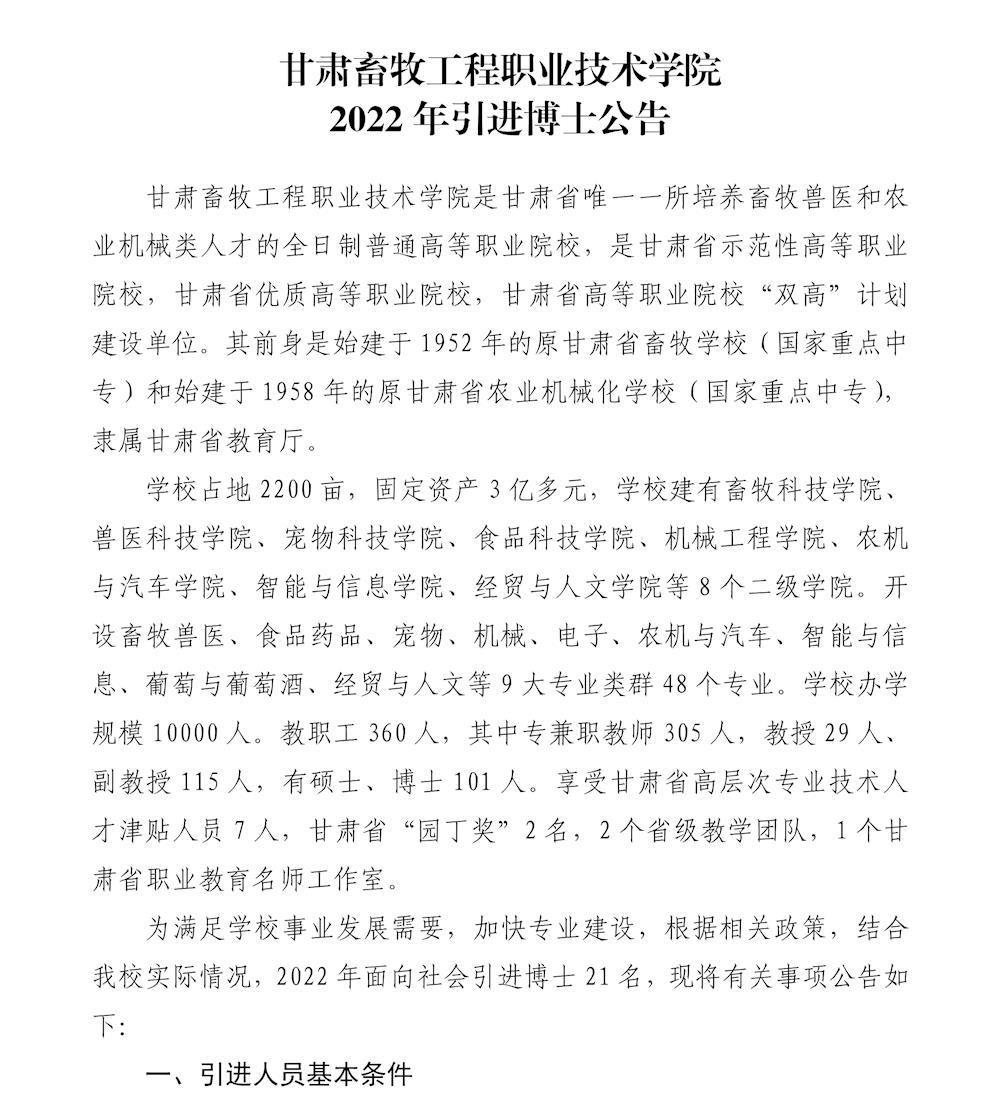 2022年甘肅畜牧工程職業(yè)技術(shù)學(xué)院引進(jìn)博士公告