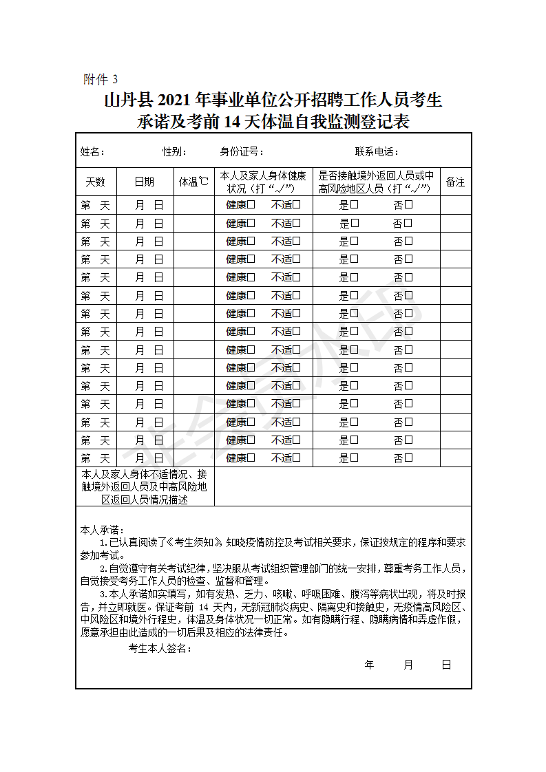 3.《山丹縣2021年事業(yè)單位公開招聘工作人員考生承諾及考前14天體溫自我監(jiān)測登記表》