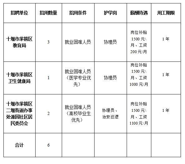 招聘公益性崗位工作人員共6名,從事協(xié)理員、護(hù)學(xué)崗等相關(guān)工作。