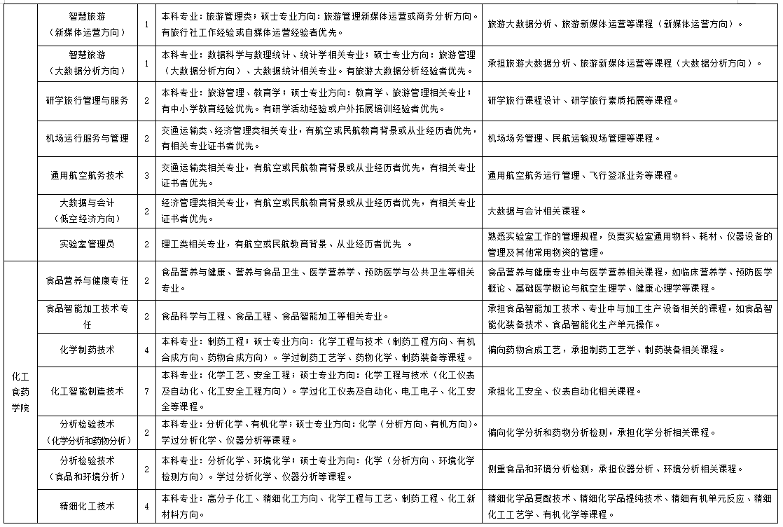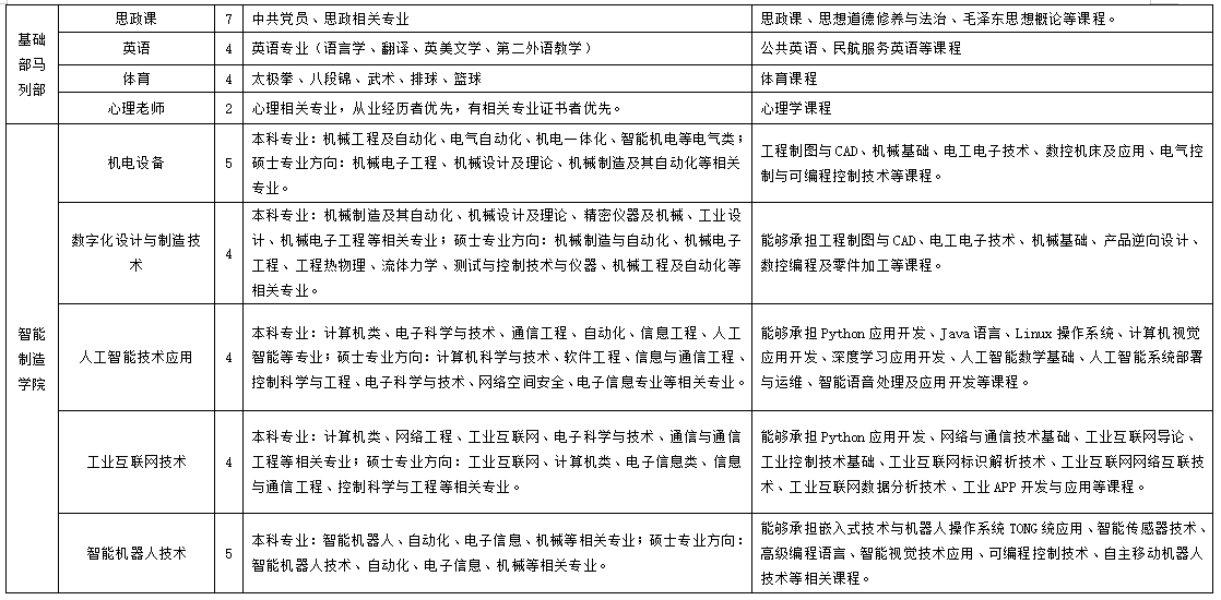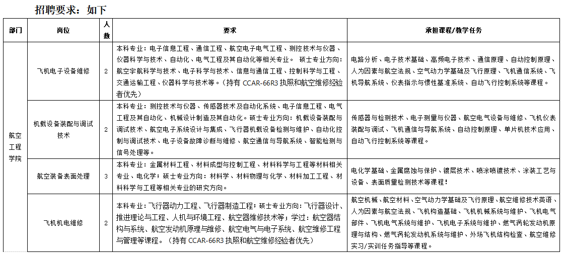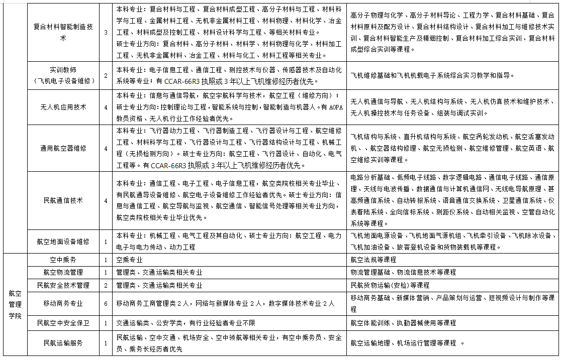 1.英語、體育、空乘專業(yè)教師,以及實(shí)訓(xùn)教師、實(shí)驗(yàn)管理員需本科及以上學(xué)歷,且具備 3 年以上高校教學(xué)經(jīng)驗(yàn)或相關(guān)工作經(jīng)驗(yàn)。