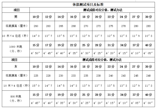 3. 體能測試: 按照縱跳摸高、10米×4折返跑、男子1000米跑、女子800米跑順序進(jìn)行,滿分100分。詳情如下:
