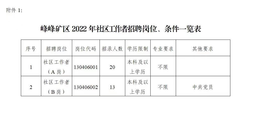 本次計(jì)劃公開(kāi)招聘社區(qū)工作者33名。工作崗位及崗位人數(shù)詳見(jiàn)附表《峰峰礦區(qū)2022年社區(qū)工作者招聘崗位、條件一覽表》。