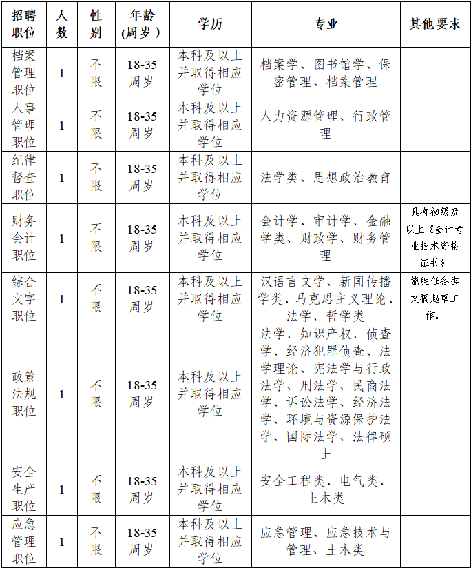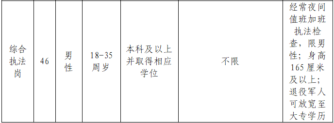 注:1.年齡計(jì)算截止日期為報(bào)名日期。2.綜合執(zhí)法崗,同等條件下優(yōu)先聘用退役軍人、有行政執(zhí)法經(jīng)驗(yàn)者;綜合執(zhí)法崗?fù)獾钠渌毼?,同等條件下優(yōu)先聘用具備1年及以上相關(guān)從業(yè)經(jīng)驗(yàn)者。