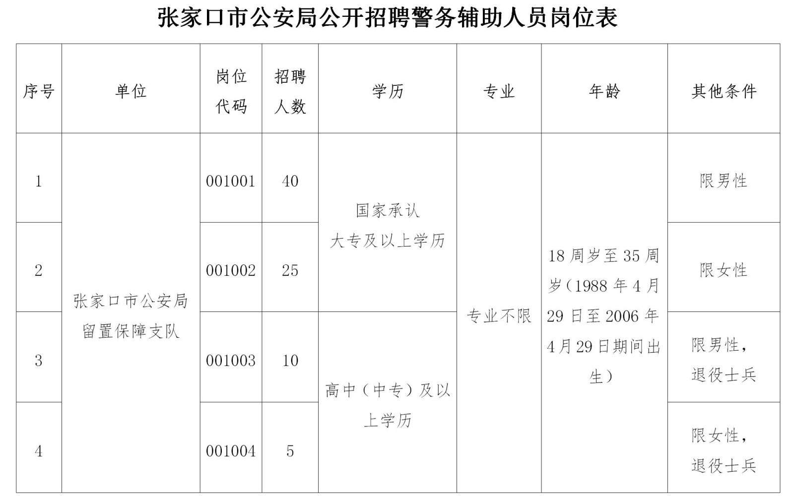此次招聘輔警共計(jì)80名,男性50名,女性30名。年齡在18周歲至35周歲(1988年4月29日至2006年4月29日期間出生),國家承認(rèn)大專及以上學(xué)歷,崗位代碼001003、001004崗位限退役士兵,學(xué)歷放寬至高中(中專)及以上,報(bào)名時(shí)須在工作簡歷中注明服役時(shí)間及部隊(duì)番號。具體詳見《張家口市公安局公開招聘警務(wù)輔助人員崗位表》,現(xiàn)役軍人、在校在讀學(xué)生均不得報(bào)考。