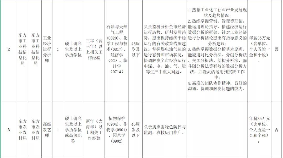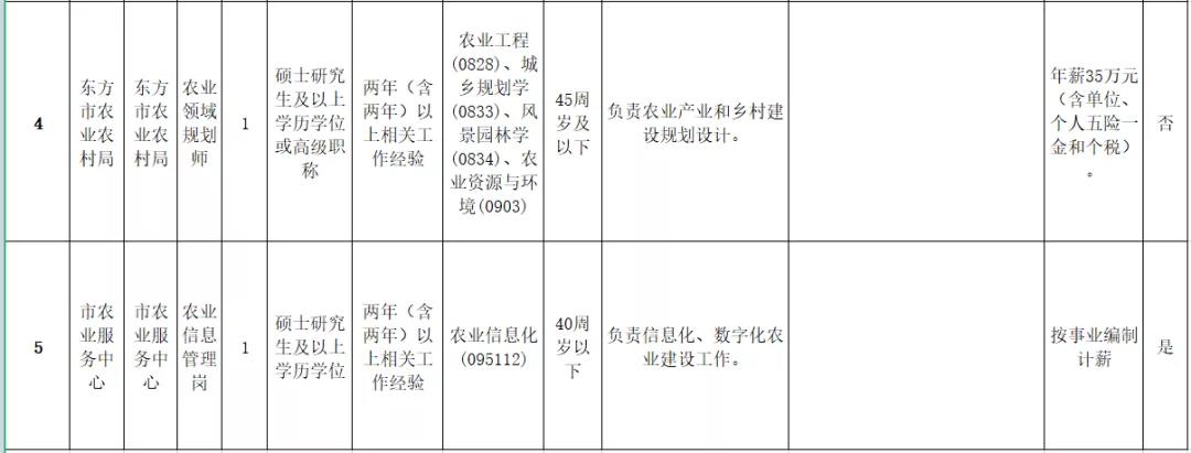 本次招聘急需緊缺人才共5名,其中納入編制管理1名。市工科信局信息化工程師1名、工業(yè)經(jīng)濟運行分析師1名;市農(nóng)業(yè)農(nóng)村局高級農(nóng)藝師1名、農(nóng)業(yè)領(lǐng)域規(guī)劃師1名;市農(nóng)業(yè)服務(wù)中心農(nóng)業(yè)信息管理崗1名(納入編制管理)。具體崗位要求詳見《東方市2021年招聘急需緊缺人才(第一批)崗位表》(附件1)。