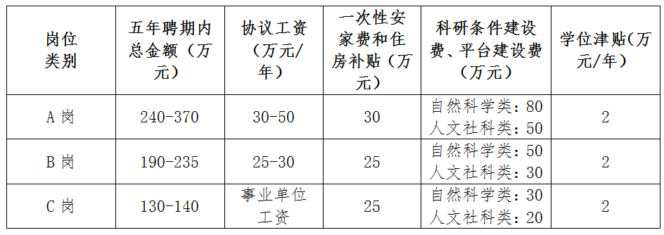 按照學(xué)校有關(guān)文件精神,與學(xué)校簽訂人才引進(jìn)協(xié)議,兌現(xiàn)人才待遇。其中,博士可申報(bào)A、B、C三類崗位,相關(guān)待遇如下: