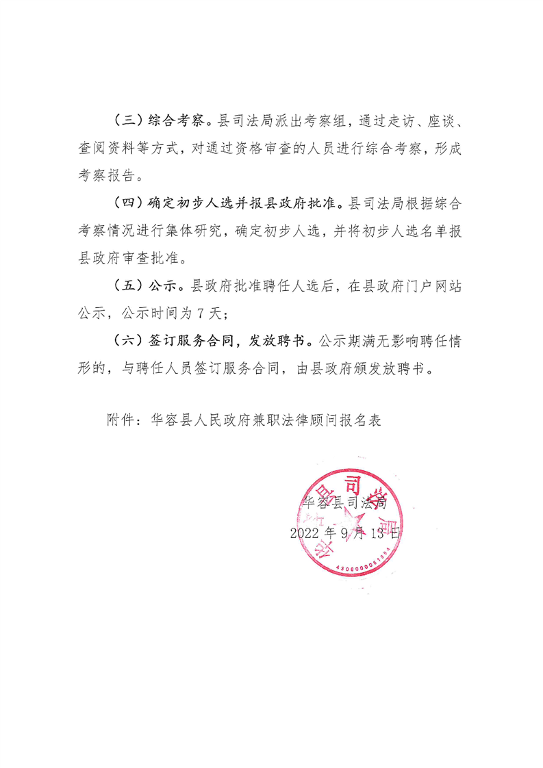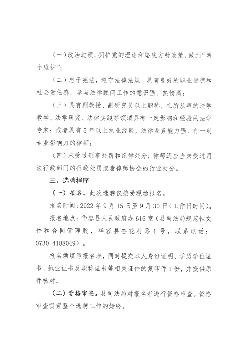 2022-09-14 11:05:00閱讀()華容縣人民政府華容縣司法局關(guān)于公開(kāi)選聘縣政府兼職法律顧問(wèn)公告
