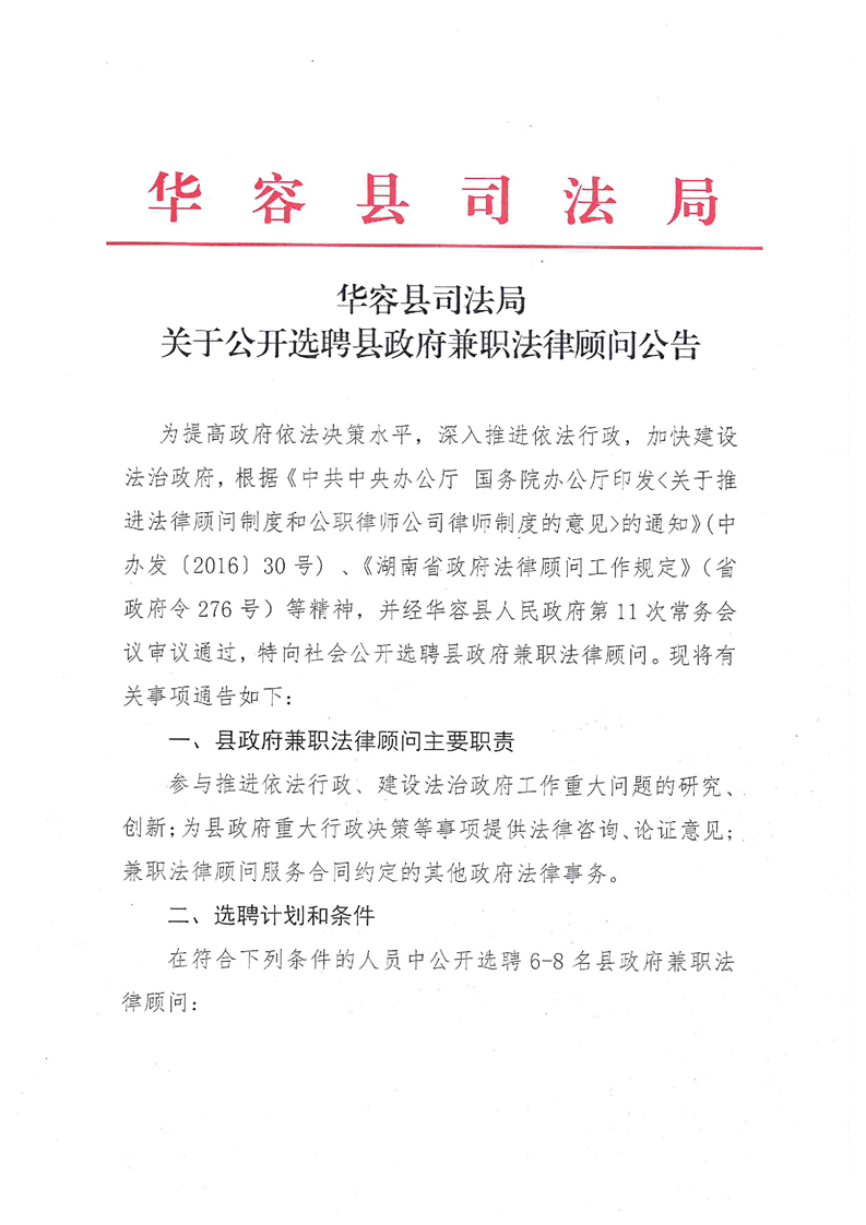 為提高政府依法決策水平,深入推進(jìn)依法行政,加快建設(shè)法治政府,根據(jù)《中共中央辦公廳國(guó)務(wù)院辦公廳印發(fā)<關(guān)于推進(jìn)法律顧問(wèn)制度和公職律師公司律師制度的意見(jiàn)>的通知》(中辦發(fā)〔2016〕30 號(hào))、《湖南省政府法律顧問(wèn)工作規(guī)定》(省政府令276號(hào))等精神,并經(jīng)華容縣人民政府第11次常務(wù)會(huì)議審議通過(guò),特向社會(huì)公開(kāi)選聘縣政府兼職法律顧問(wèn)。現(xiàn)將有關(guān)事項(xiàng)通告如下: