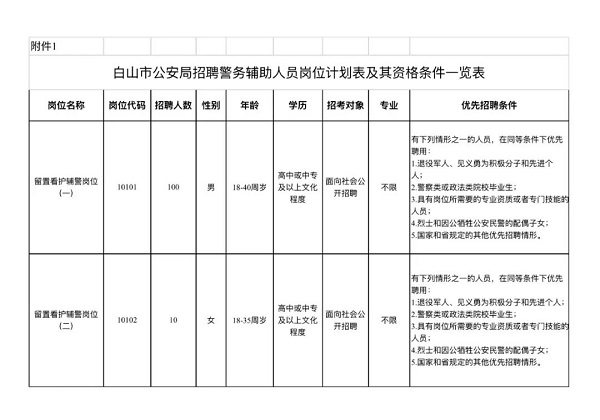 1.白山市公安局招聘警務輔助人員崗位計劃表及其資格條件一覽表