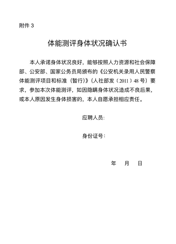 3.體能測評項目和標準:按照《公安機關錄用人民警察體能測評項目和標準(暫行)》執(zhí)行,項目為:10米×4往返跑、縱跳摸高、男子1000米跑/女子800米跑,須三項測試均達標為合格,詳見《體能測評項目和標準》(附件2)。不適宜劇烈運動或有隱形疾病的不得參加體能測試,否則后果自負;