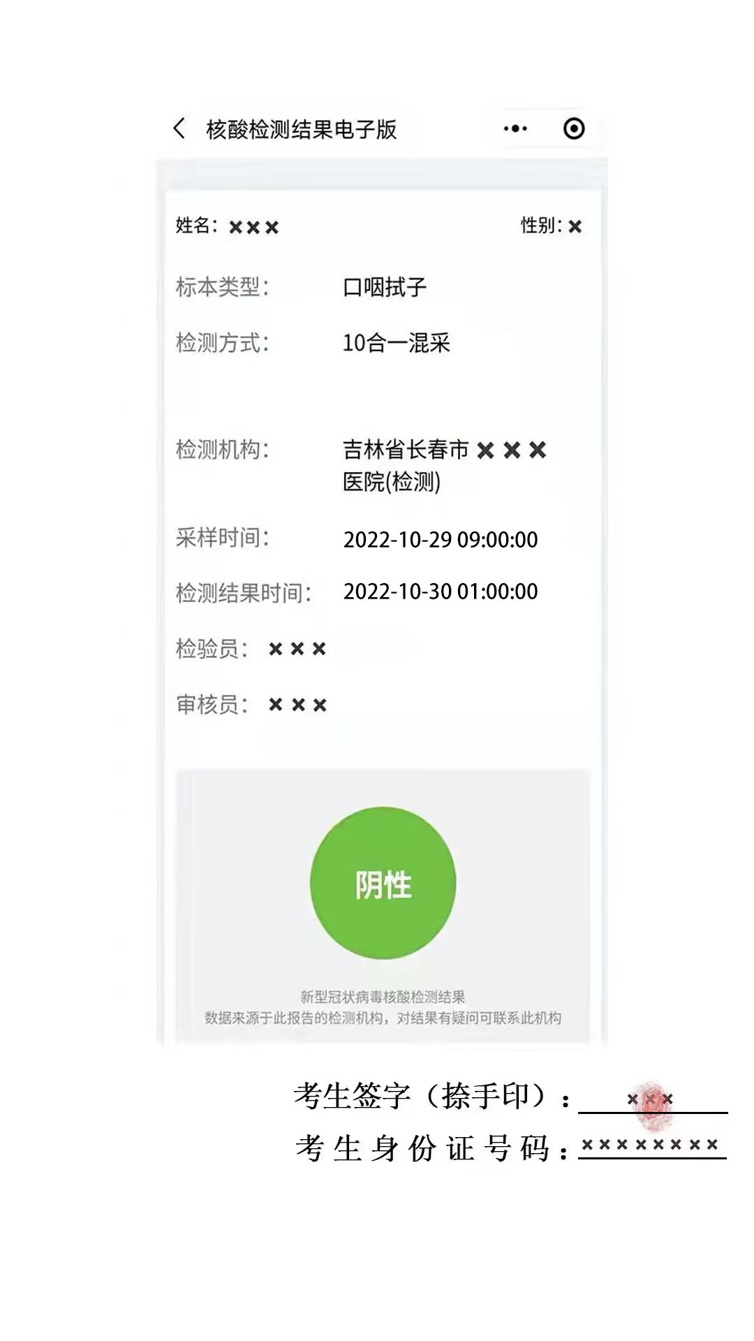 (三)所有應(yīng)試人員在進(jìn)入考點(diǎn)時(shí)應(yīng)接受“吉祥碼”“通信大數(shù)據(jù)行程卡”“核酸檢測(cè)報(bào)告”查驗(yàn)及體溫測(cè)量??忌仨殧y帶入場(chǎng)前24小時(shí)內(nèi)(以采樣時(shí)間為準(zhǔn))長(zhǎng)春市檢測(cè)機(jī)構(gòu)出具的新冠病毒核酸檢測(cè)陰性證明參加考試。證明須為長(zhǎng)春市有資質(zhì)的檢測(cè)機(jī)構(gòu)出具的,能明確顯示核酸檢測(cè)報(bào)告時(shí)間的紙質(zhì)報(bào)告或打印紙質(zhì)版的“吉事辦”小程序核酸檢測(cè)結(jié)果截圖(圖例見附件5,需注明姓名、身份證號(hào)并由本人簽字捺手印)。