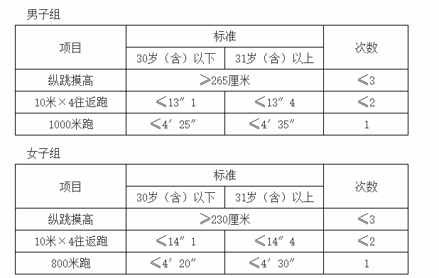 3.體能測(cè)評(píng)項(xiàng)目和標(biāo)準(zhǔn):按照《公安機(jī)關(guān)錄用人民警察體能測(cè)評(píng)項(xiàng)目和標(biāo)準(zhǔn)(暫行)》執(zhí)行。