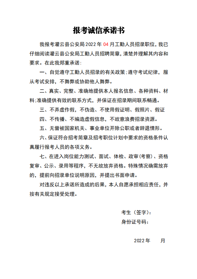 8.連云港市公安機(jī)關(guān)在職輔警、工勤人員需攜帶單位同意報(bào)考證明。曾因違反公安機(jī)關(guān)管理規(guī)定解除勞動合同的人員,不得報(bào)考。應(yīng)聘人員如提供虛假材料,一經(jīng)查實(shí),即取消報(bào)名資格。對偽造、變造有關(guān)證件、材料、信息、騙取招考資格的,將按有關(guān)法律法規(guī)嚴(yán)肅處理。