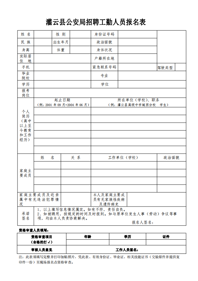 應(yīng)聘人員須按照應(yīng)聘崗位要求,真實(shí)、準(zhǔn)確、完整和規(guī)范填寫報(bào)名表、報(bào)考誠信承諾書,連同應(yīng)聘崗位所需有關(guān)證明材料電子版(可以是PDF、JPEG、JPG等形式),發(fā)送至郵箱:gygazp@126.com,郵件主題為:“應(yīng)聘崗位代碼+姓名+聯(lián)系電話”。郵件接收成功后,將于48小時(shí)內(nèi)回復(fù)資格初審意見,如未收到資格初審意見,請及時(shí)與灌云縣公安局聯(lián)系,聯(lián)系電話:0518-81868627。