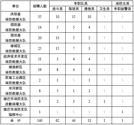 2023-10-26 22:55:54閱讀()宿遷人才網(wǎng)因工作需要,宿遷市消防救援支隊(duì)計(jì)劃面向社會(huì)公開招聘140名專職消防員(編外),具體招聘事宜公告如下: