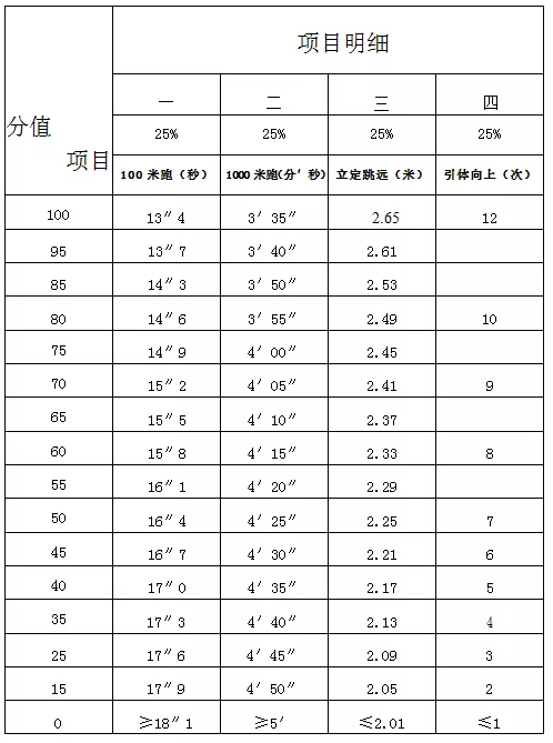 (3)測(cè)試項(xiàng)目:1000米跑、100米跑、立定跳遠(yuǎn)、引體向上各占25分的權(quán)重分值(評(píng)分標(biāo)準(zhǔn)見(jiàn)附件二)。