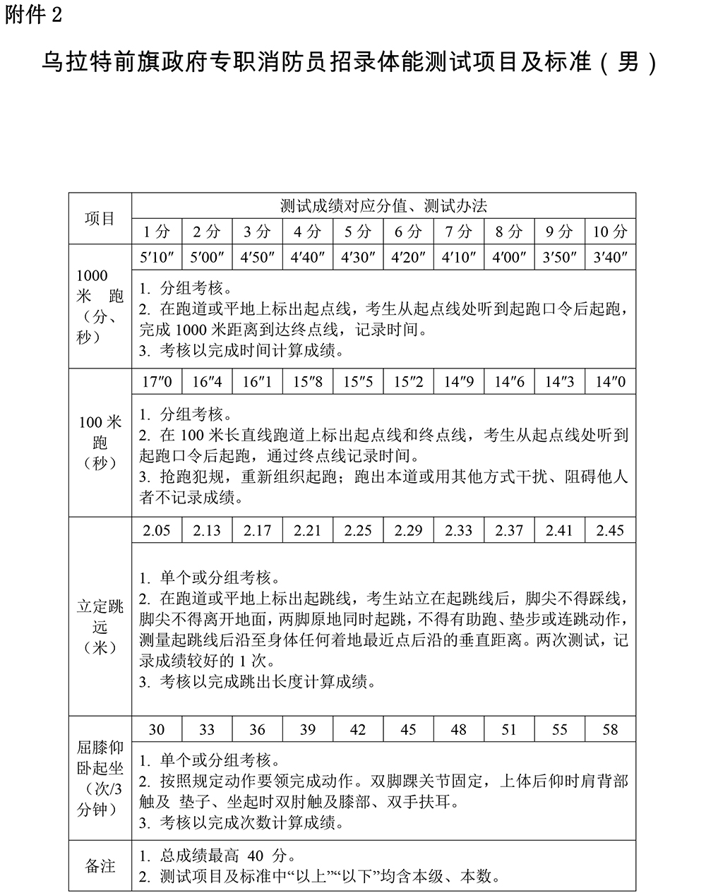 (五)達到烏拉特前旗政府專職消防員招錄體能測試標準(見附件2);