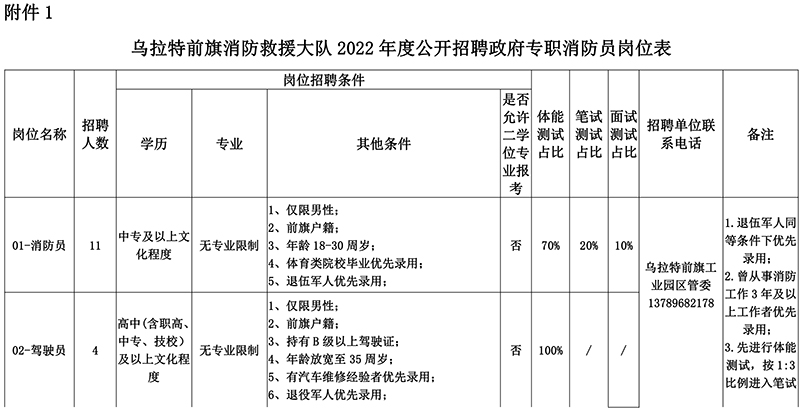 由烏拉特前旗工業(yè)園區(qū)管委會負責公開招聘政府專職消防員15名,持有B級以上駕駛證招聘2名。(詳見附件1)。由烏拉特前旗工業(yè)園區(qū)管委會依法與其訂立勞動合同,合同期為3年。屆滿后,烏拉特前旗工業(yè)園區(qū)管委會按照績效考核結果決定是否續(xù)簽勞動合同。
