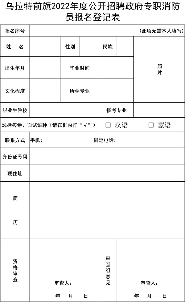 8.《烏拉特前旗2022年度公開招聘政府專職消防員報名登記表》;