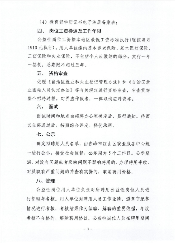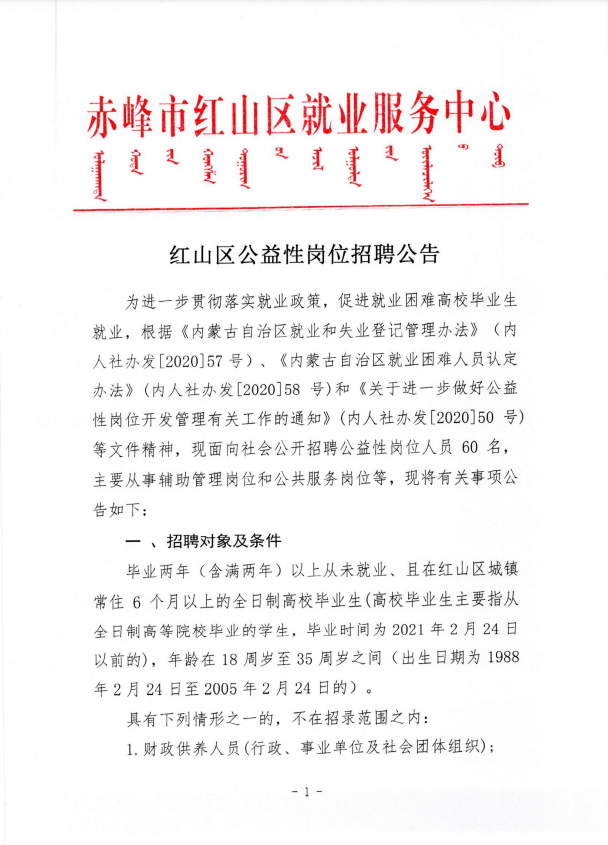 2023-02-28 14:38:43閱讀()赤峰公共招聘網(wǎng)為進(jìn)一步貫徹落實(shí)就業(yè)政策,促進(jìn)就業(yè)困難高校畢業(yè)生就業(yè),根據(jù)《內(nèi)蒙古自治區(qū)就業(yè)和失業(yè)登記管理辦法》(內(nèi)人社辦發(fā)[2020]57號)、《內(nèi)蒙古自治區(qū)就業(yè)困難人員認(rèn)定辦法》(內(nèi)人社辦發(fā)[2020]58號)和《關(guān)于進(jìn)一步做好公益性崗位開發(fā)管理有關(guān)工作的通知》(內(nèi)人社辦發(fā)[2020]50號)等文件精神,現(xiàn)面向社會公開招聘公益性崗位人員60 名,主要從事輔助管理崗位和公共服務(wù)崗位等,現(xiàn)將有關(guān)事項(xiàng)公告如下: