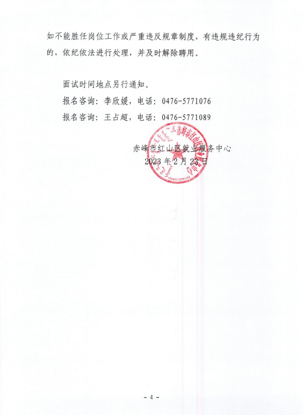 確定擬聘用人員名單,由赤峰市紅山區(qū)就業(yè)服務(wù)中心統(tǒng)一進(jìn)行公示,接受社會監(jiān)督,公示期為5個工作日。公示期滿,對沒有問題或者反映問題不影響聘用的,辦理聘用手續(xù)。對反映有嚴(yán)重問題的并查有實(shí)據(jù)的,取消聘用資格。