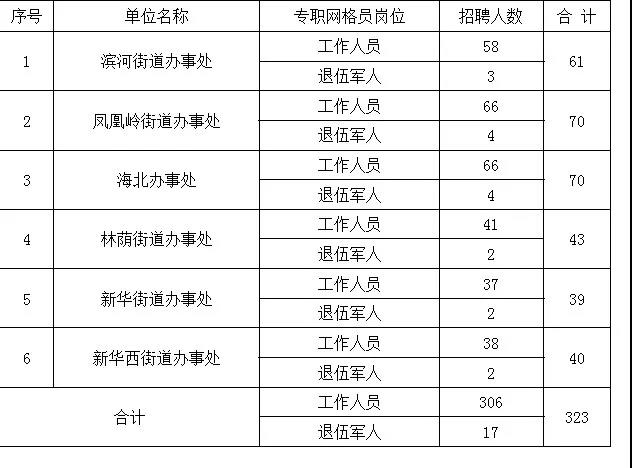 本次計劃公開招聘專職網(wǎng)格員323人,其中:烏海市海勃灣區(qū)濱河街道辦事處61人,鳳凰嶺街道辦事處70人,海北街道辦事處70人,林蔭街道辦事處43人,新華街道辦事處39人,新華西街道辦事處40人。每人只限報考一個崗位。