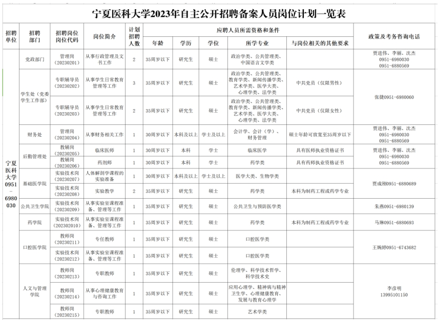4.身心健康,符合《寧夏醫(yī)科大學(xué)2023年自主公開(kāi)招聘?jìng)浒溉藛T崗位計(jì)劃一覽表》中崗位條件。