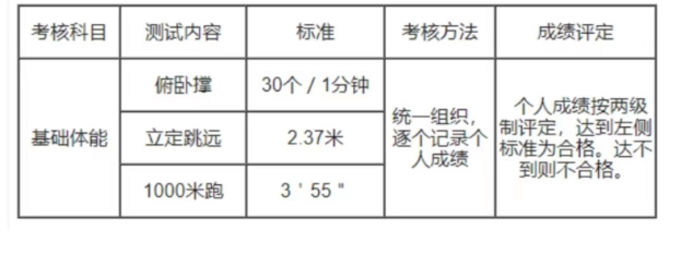 體能測(cè)試主要項(xiàng)目:1000米跑、仰臥起坐、立定跳遠(yuǎn),各項(xiàng)目測(cè)試標(biāo)準(zhǔn)如下: