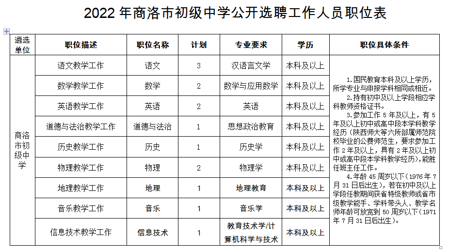 1.2022年商洛市初級中學(xué)公開選聘工作人員職位表