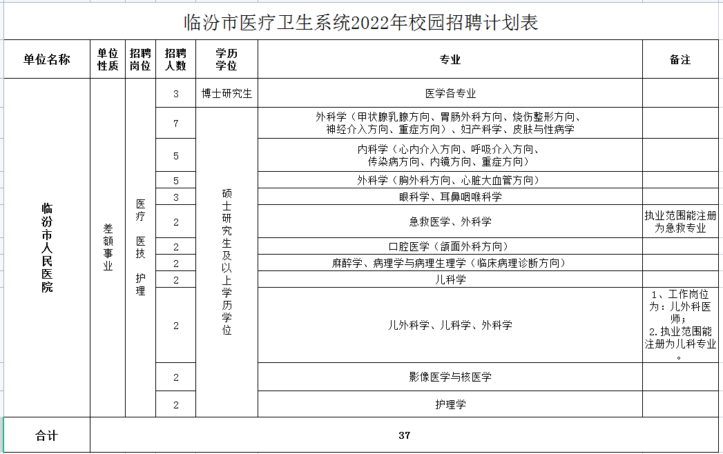 2022-01-10 00:30:47閱讀()臨汾市人民醫(yī)院為加強(qiáng)我院醫(yī)療專業(yè)技術(shù)人員隊(duì)伍建設(shè),根據(jù)《事業(yè)單位人事管理?xiàng)l例》以及我省《關(guān)于進(jìn)一步改進(jìn)和加強(qiáng)事業(yè)單位公開招聘工作的意見》、《關(guān)于深化高等院校、科研院所、公立醫(yī)院人事管理改革有關(guān)事項(xiàng)的通知》等相關(guān)要求,開展2022年校園招聘工作,擬招聘37名工作人員,現(xiàn)公告如下: