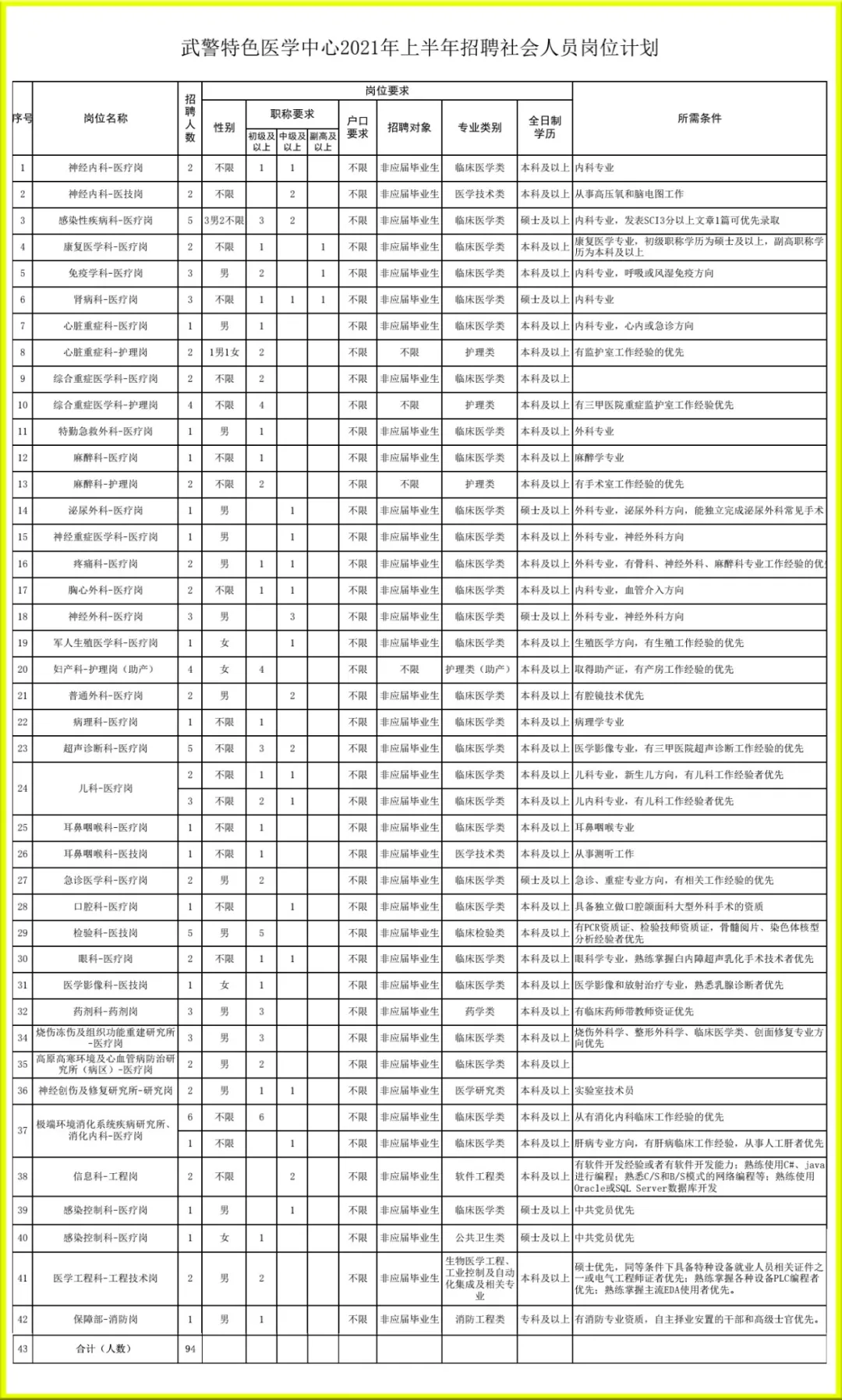 3.報名要求:應(yīng)聘人員須提供身份證、學(xué)歷學(xué)位證書、相應(yīng)資格證書等個人報名信息支撐材料,如提供虛假材料,將取消面試資格并列入錄用黑名單。應(yīng)聘人員每人限填報一個崗位,報名信息經(jīng)審核后不得修改。具體崗位設(shè)置條件見《武警特色醫(yī)學(xué)中心2021年上半年社會人員招聘崗位計劃》。