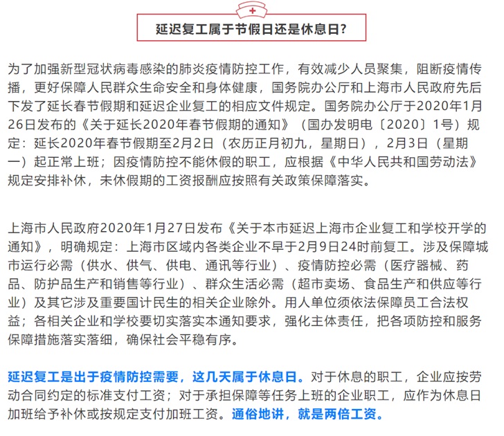 日前,國務(wù)院辦公廳于2020年1月26日發(fā)布的《關(guān)于延長2020年春節(jié)假期的通知》(國辦發(fā)明電〔2020〕1號(hào))規(guī)定:延長2020年春節(jié)假期至2月2日(農(nóng)歷正月初九,星期日),2月3日(星期一)起正常上班;因疫情防控不能休假的職工,應(yīng)根據(jù)《中華人民共和國勞動(dòng)法》規(guī)定安排補(bǔ)休,未休假期的工資報(bào)酬應(yīng)按照有關(guān)政策保障落實(shí)。