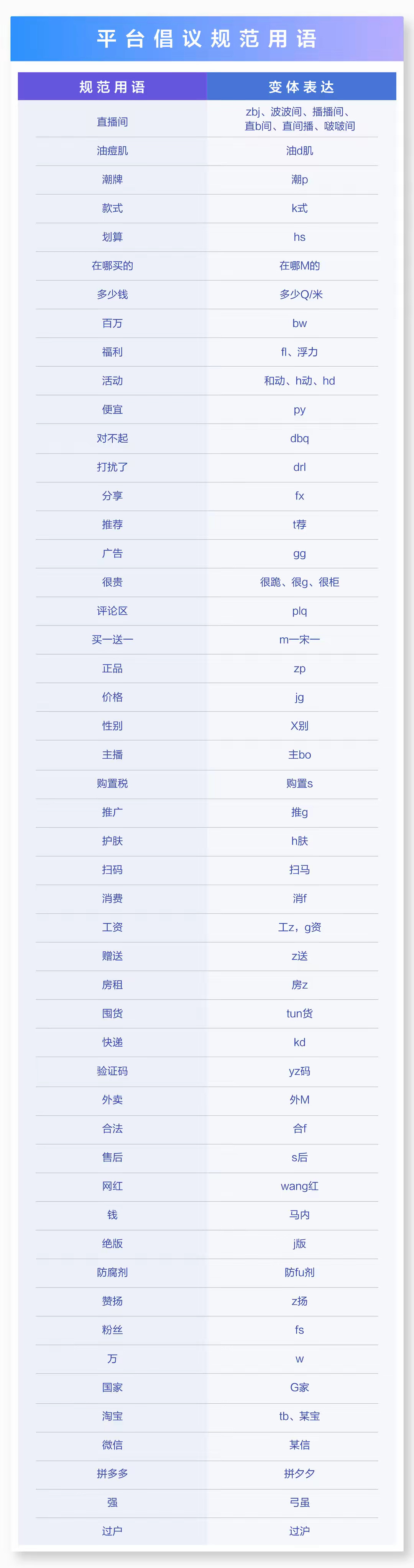獲悉,李亮還展示了一張“平臺倡議規(guī)范用語”圖表。