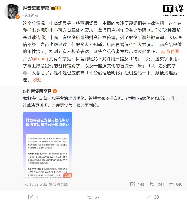 2025-01-07 11:02:40閱讀()互聯(lián)網(wǎng)1月3日,抖音集團副總裁李亮發(fā)文宣布將推動算法和平臺治理透明化,當晚有網(wǎng)友評論提出意見:“抖音到底允不允許用戶提及‘錢’‘死’這類字眼,字幕上故意出現(xiàn)的各種錯別字,以及一些沒文化的盲流子‘米’‘si’之類的字幕,太惡心了。是不是也應該算‘平臺治理透明化’透明澄清一下,順便治理治理。”