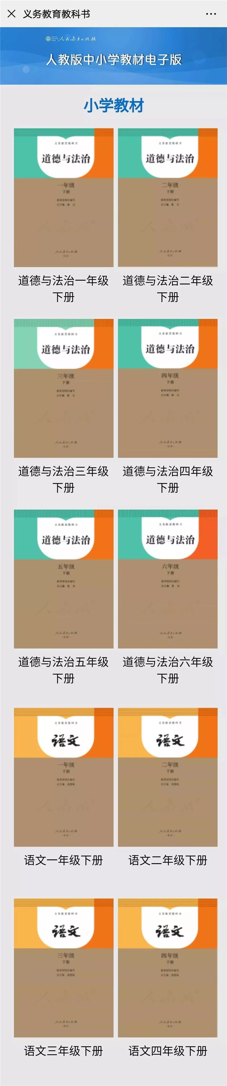 例如:點(diǎn)擊“義務(wù)教育教科書(shū)”,選擇小學(xué)教材中的“語(yǔ)文一年級(jí)下冊(cè)”,即可獲取相對(duì)應(yīng)的電子版教科書(shū)。