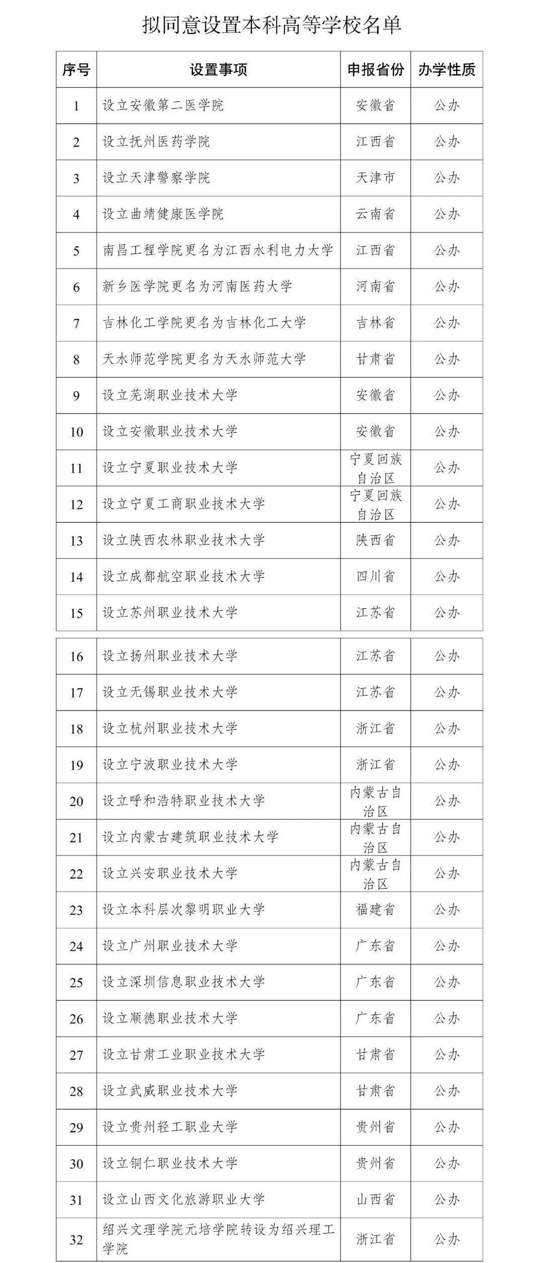 根據(jù)《中華人民共和國高等教育法》《普通高等學(xué)校設(shè)置暫行條例》《普通本科學(xué)校設(shè)置暫行規(guī)定》《本科層次職業(yè)學(xué)校設(shè)置標(biāo)準(zhǔn)(試行)》等有關(guān)規(guī)定以及第八屆全國高等學(xué)校設(shè)置評(píng)議委員會(huì)考察評(píng)議結(jié)果,經(jīng)教育部黨組會(huì)議審議,擬同意設(shè)置安徽第二醫(yī)學(xué)院等32所學(xué)校,現(xiàn)予公示。