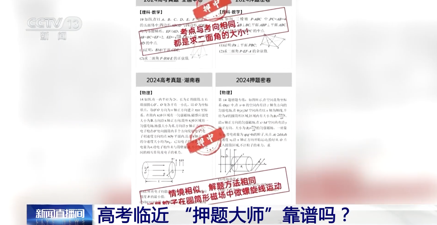 以2024年高考真題為例,央視網(wǎng)記者發(fā)現(xiàn)在某“AI高考押題卷”詳情中,列舉了各科多道“押中”題目,可再一細(xì)看,似乎又不是那么回事。一道數(shù)學(xué)幾何題,真題為五面體,押題卷為三棱錐,題干、設(shè)問(wèn)均不相同,僅因均考查了“二面角的大小”這同一個(gè)考點(diǎn),就判定為“押中”。
