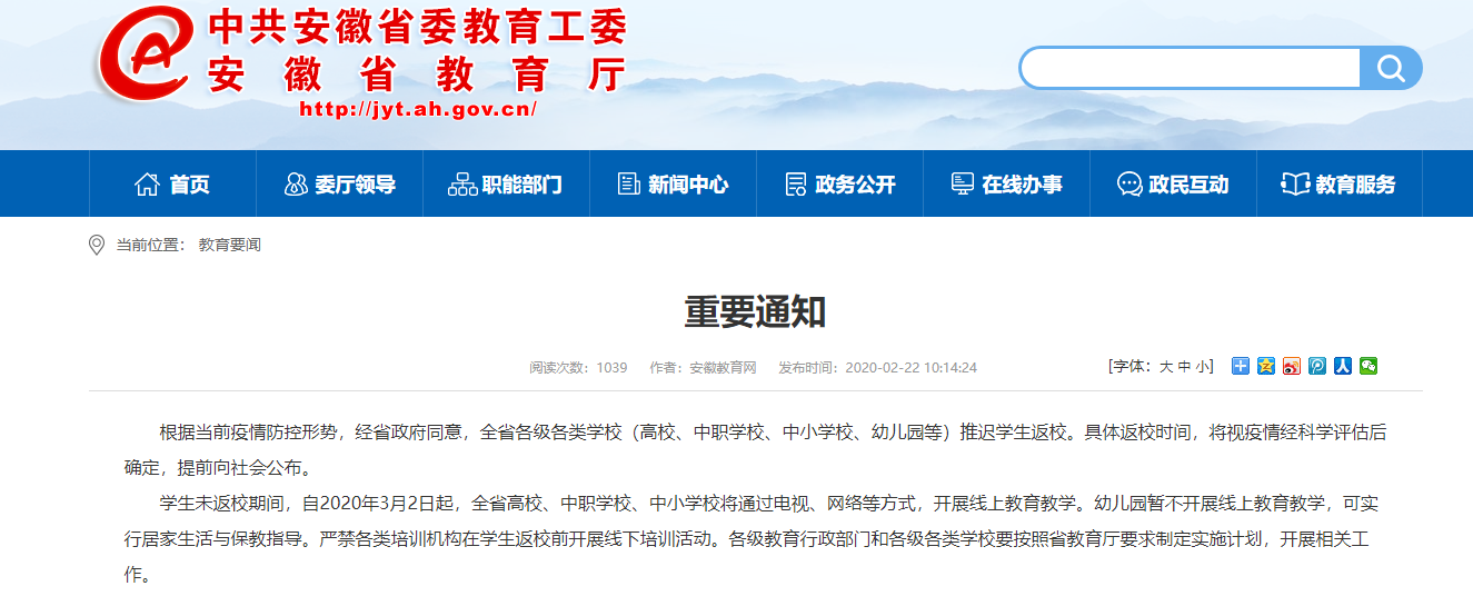 2020-02-22 13:49:58閱讀()安徽省教育廳省教育廳剛下發(fā)重要通知,根據(jù)當前疫情防控形勢,經省政府同意,全省各級各類學校(高校、中職學校、中小學校、幼兒園等)推遲學生返校。具體返校時間,將視疫情經科學評估后確定,提前向社會公布。
