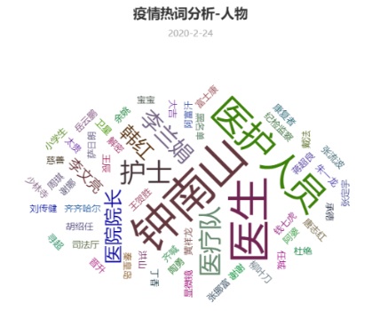 我們對疫情相關(guān)熱搜中與人物相關(guān)的詞作了統(tǒng)計,其中出現(xiàn)頻率最高的是鐘南山院士,其次是醫(yī)護人員、醫(yī)生、醫(yī)療隊和護士。