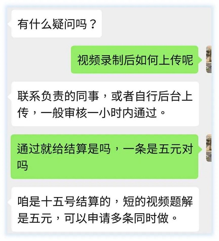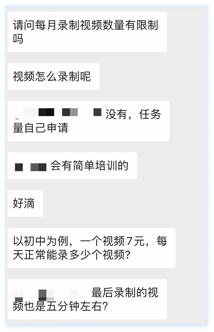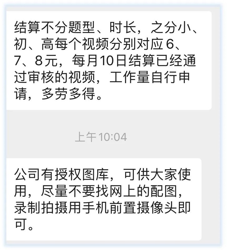 另一家位于寧波的在線教育機(jī)構(gòu)更是開(kāi)出了超低的薪酬,“大家可以多錄些視頻,如果通過(guò)的話,文科短視頻每條5元,理科短視頻是6元。”群里一位負(fù)責(zé)統(tǒng)籌的工作人員如是說(shuō)。