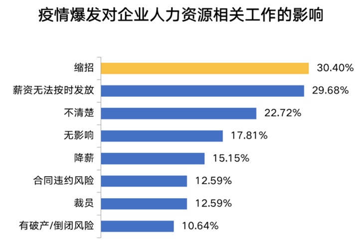 根據(jù)智聯(lián)招聘的調(diào)查,30.4% 的企業(yè)表示將會(huì)減員縮編,還有 29.68% 無法為員工按時(shí)發(fā)放薪資,無影響的企業(yè)僅占 17.81% 。另外,慘淡經(jīng)營下,降薪、合同違約風(fēng)險(xiǎn)、裁員也成為企業(yè)不得不面對的問題,10.64% 的受訪企業(yè)面臨著破產(chǎn)或倒閉的風(fēng)險(xiǎn)。