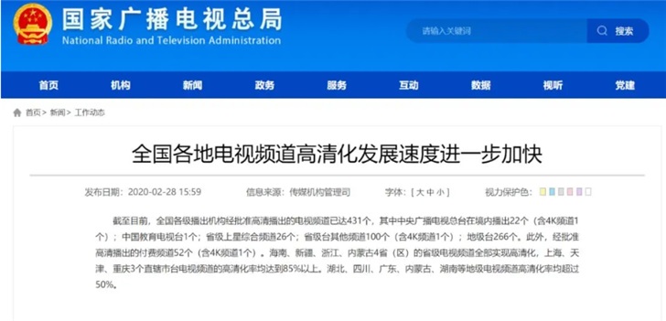 廣電總局:全國高清播出電視頻道已達(dá)431個(gè)