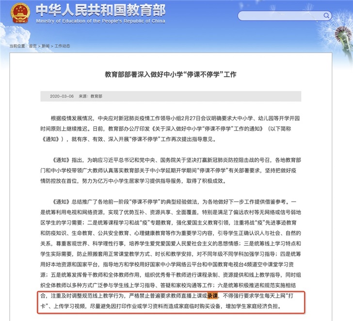 2020-03-07 10:40:54閱讀()教育部國(guó)家教育部在3月6日發(fā)布了名為《教育部部署深入做好中小學(xué)“停課不停學(xué)”工作》,其中要求嚴(yán)格禁止普遍要求教師直播上課或錄課,不得強(qiáng)行要求學(xué)生每天上網(wǎng)“打卡”、上傳學(xué)習(xí)視頻。