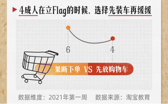 報(bào)告顯示,成年人的Flag往往自定義,周期長(zhǎng)、見效慢、年復(fù)一年,4成消費(fèi)者選擇把Flag先放購(gòu)物車晾一晾,等待下一個(gè)躊躇滿志的時(shí)刻;小朋友的Flag“娘定義”,往往短平快、目標(biāo)準(zhǔn)、使命必達(dá)。