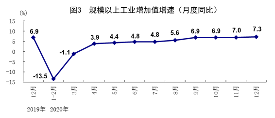 全年全國規(guī)模以上工業(yè)增加值比上年增長2.8%。分經(jīng)濟類型看,國有控股企業(yè)增加值增長2.2%;股份制企業(yè)增長3.0%,外商及港澳臺商投資企業(yè)增長2.4%;私營企業(yè)增長3.7%。分三大門類看,采礦業(yè)增加值增長0.5%,制造業(yè)增長3.4%,電力、熱力、燃氣及水生產(chǎn)和供應(yīng)業(yè)增長2.0%。高技術(shù)制造業(yè)和裝備制造業(yè)增加值分別比上年增長7.1%、6.6%,增速分別比規(guī)模以上工業(yè)快4.3、3.8個百分點。從產(chǎn)品產(chǎn)量看,工業(yè)機器人、新能源汽車、集成電路、微型計算機設(shè)備同比分別增長19.1%、17.3%、16.2%、12.7%。四季度,規(guī)模以上工業(yè)增加值同比增長7.1%,比三季度加快1.3個百分點。12月份,規(guī)模以上工業(yè)增加值同比增長7.3%,比上月加快0.3個百分點,環(huán)比增長1.10%。2020年,全國工業(yè)產(chǎn)能利用率為74.5%。四季度,全國工業(yè)產(chǎn)能利用率為78.0%,比三季度上升1.3個百分點。