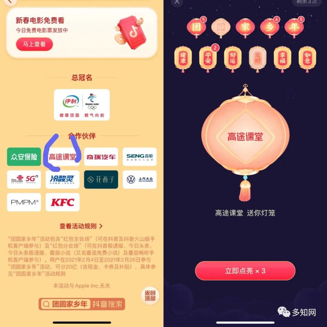 “團(tuán)圓家鄉(xiāng)年”活動(dòng)由伊利總冠名,還有10家不同行業(yè)的合作伙伴,高途課堂是其中之一。在點(diǎn)亮燈籠時(shí)贊助商會(huì)隨機(jī)展示,如“高途課堂”送你燈籠。